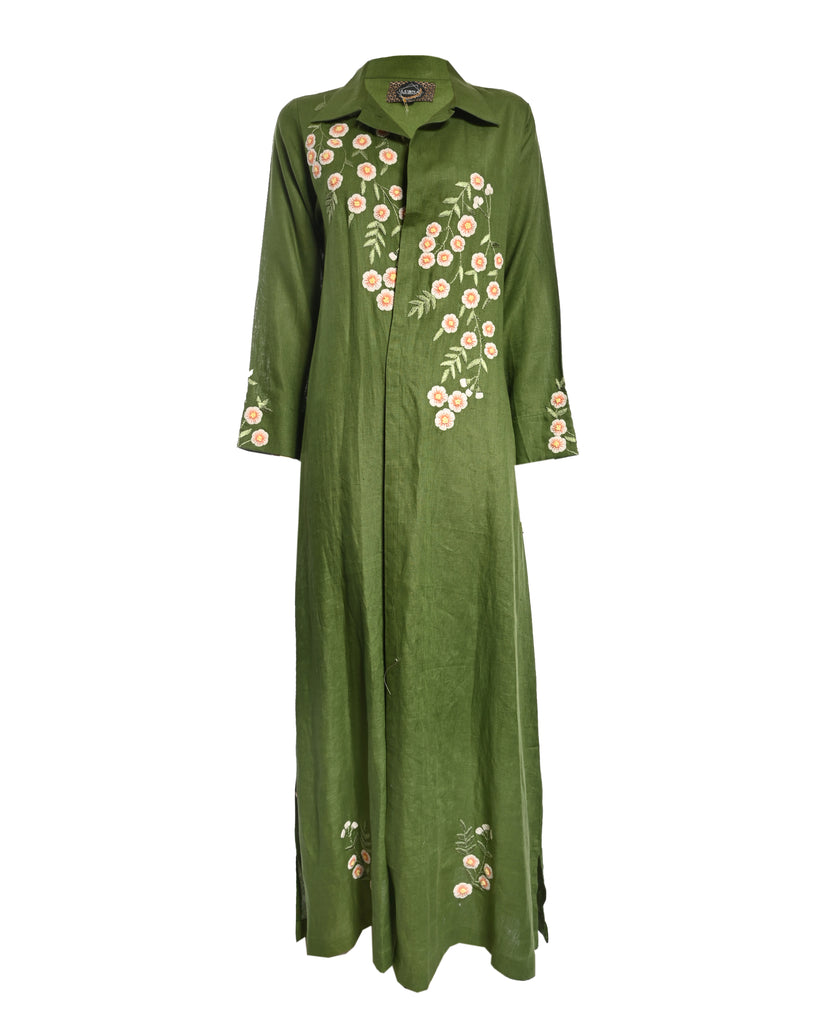 Green Linen Embroidered Abaya